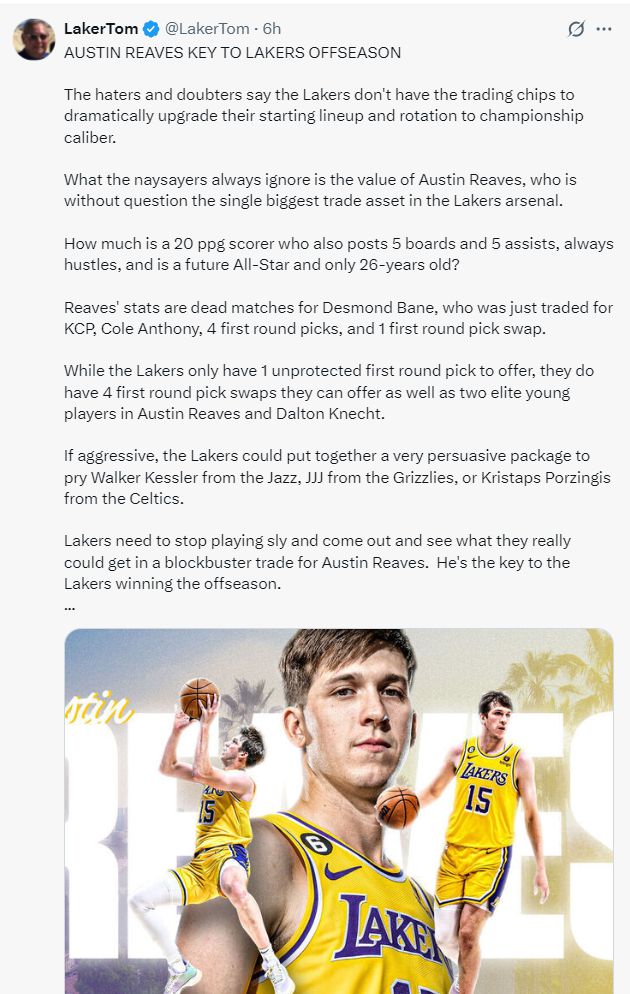 湖媒Laker Tom依旧认为里夫斯要长留这里难度很大,他直言里夫斯是湖人休赛期的关键人物,湖人没有足够的交易筹码来大幅度提升他们的首发阵容与轮换阵容,里夫斯是湖人最好的交易资产。